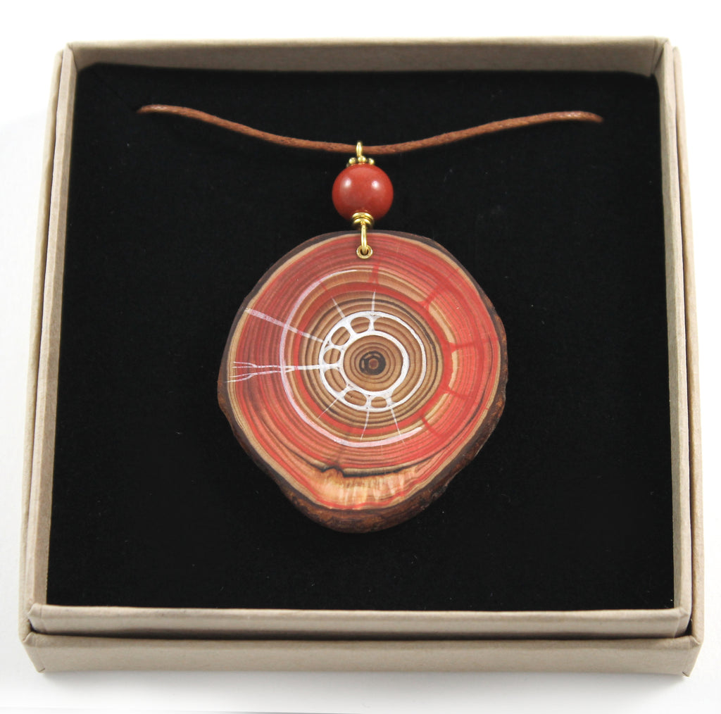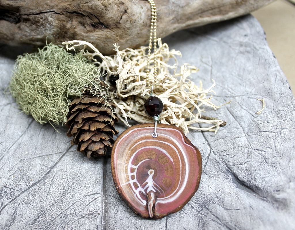 Handgefertigtes Amulett aus einer natürlichen Holzscheibe (Lärche, Apfel oder Zirbe) – jedes Stück ein liebevolles Unikat von Naturlieb®. Die handbemalte Scheibe (Durchmesser ca. 3–4,5 cm) wird veredelt mit echten Halbedelsteinen wie Granat, Jaspis, rotem Tigerauge oder Hämatit und hochwertigem 925er Sterlingsilber (rosévergoldet oder vergoldet).